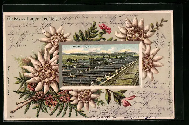 Lithographie Lager-Lechfeld, Baracken-Lager aus der Vogelschau, Blumenstrauss