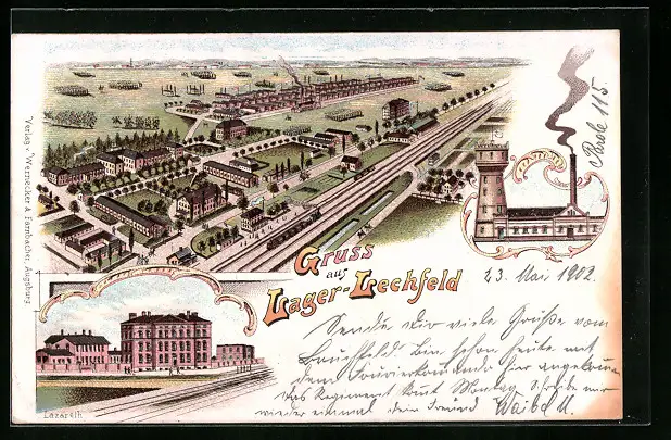 Lithographie Lager Lechfeld, Gesamtansicht aus der Vogelschau, Lazareth