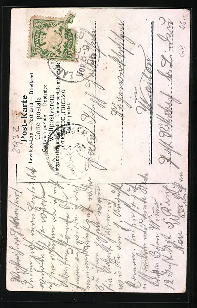 Personenbezogene Daten auf der Rückseite der Karte wurden durch blauen Textmarker unkenntlich gemacht. Die blauen Stellen sind auf die Vorderseite durchgeweicht und wirken sich negativ auf das Postkartenfoto aus