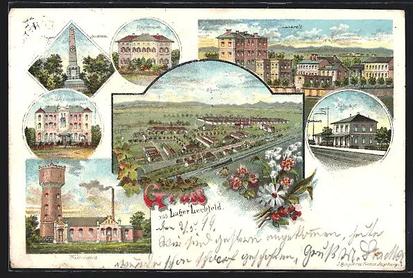 Lithographie Lager Lechfeld, Totalansicht, Bahnhof, Wasserwerk