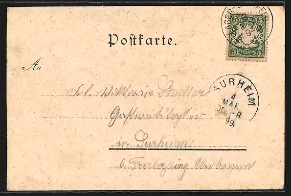 Personenbezogene Daten auf der Rückseite der Karte wurden durch blauen Textmarker unkenntlich gemacht. Die blauen Stellen sind auf die Vorderseite durchgeweicht und wirken sich negativ auf das Postkartenfoto aus