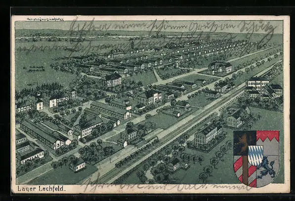 Lithographie Lager Lechfeld, Totalansicht aus der Vogelschau, Wappen