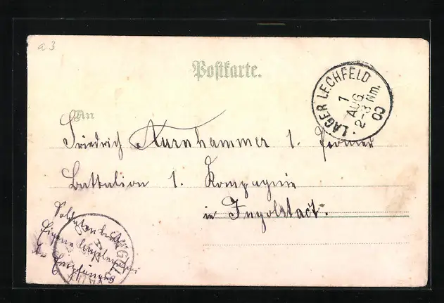 Personenbezogene Daten auf der Rückseite der Karte wurden durch blauen Textmarker unkenntlich gemacht. Die blauen Stellen sind auf die Vorderseite durchgeweicht und wirken sich negativ auf das Postkartenfoto aus