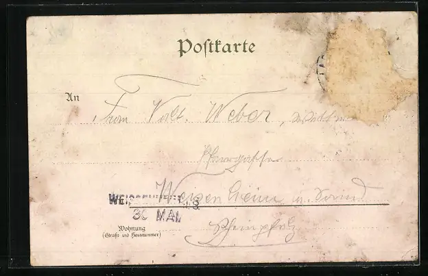 Personenbezogene Daten auf der Rückseite der Karte wurden durch blauen Textmarker unkenntlich gemacht. Die blauen Stellen sind auf die Vorderseite durchgeweicht und wirken sich negativ auf das Postkartenfoto aus
