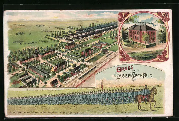 Lithographie Lager Lechfeld, Totalansicht, marschierendes Heer