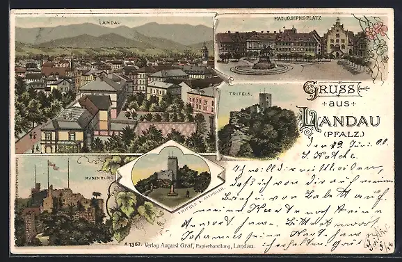 Lithographie Landau / Pfalz, Madenburg, Max-Josephs-Platz, Trifels