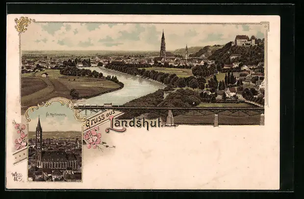 Lithographie Landshut, Totalansicht, St. Martinsturm
