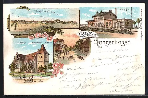 Lithographie Langenhagen, Bahnhof, Kirche und Totalansicht