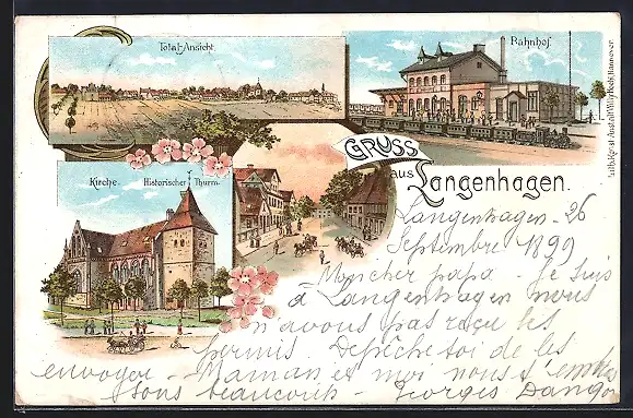Lithographie Langenhagen, Bahnhof, Kirche und Totalansicht