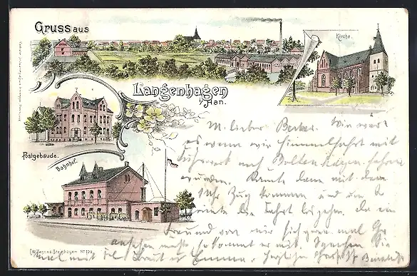Lithographie Langenhagen i. Han, Postgebäude, Kirche, Bahnhof