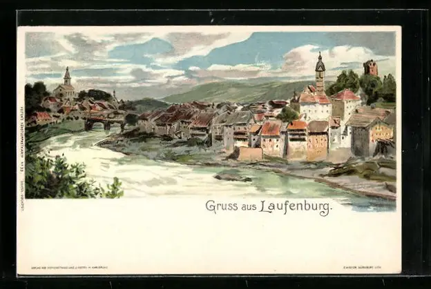 Lithographie Laufenburg, Ortsansicht mit Flusspartie