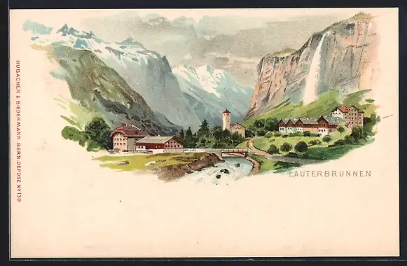 Lithographie Lauterbrunnen, Panorama mit schneebedeckten Bergen
