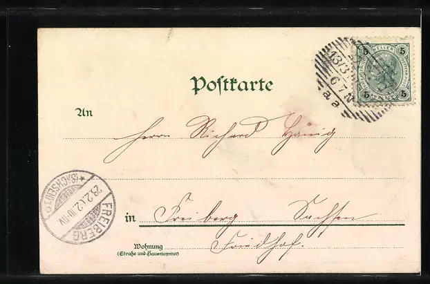 Personenbezogene Daten auf der Rückseite der Karte wurden durch blauen Textmarker unkenntlich gemacht. Die blauen Stellen sind auf die Vorderseite durchgeweicht und wirken sich negativ auf das Postkartenfoto aus