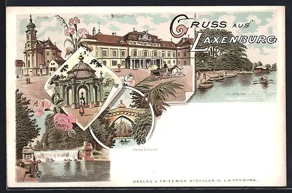 Lithographie Laxenburg, Strassenpartie, Brücke, Bootspartie, Blumen