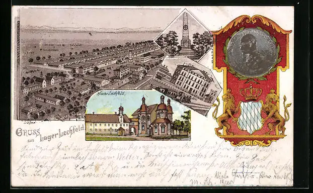 Lithographie Lechfeld, Lager Lechfeld, Kloster Lechfeld, Denkmal