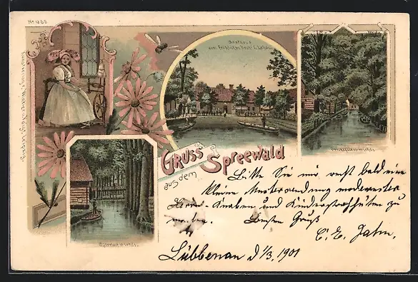 Lithographie Lehde, Gasthaus Zum fröhlichen Hecht, Spreewälderin am Spinnrad
