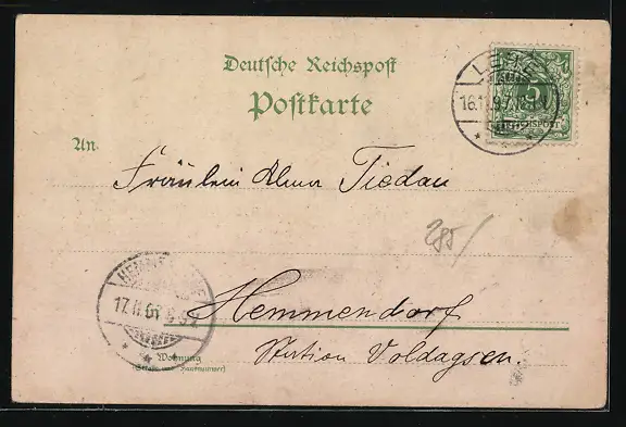 Personenbezogene Daten auf der Rückseite der Karte wurden durch blauen Textmarker unkenntlich gemacht. Die blauen Stellen sind auf die Vorderseite durchgeweicht und wirken sich negativ auf das Postkartenfoto aus
