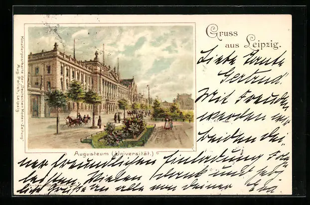 Lithographie Leipzig, Augusteum (Universität) mit Strasse und Anlage