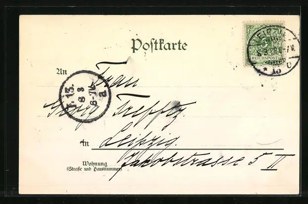 Personenbezogene Daten auf der Rückseite der Karte wurden durch blauen Textmarker unkenntlich gemacht. Die blauen Stellen sind auf die Vorderseite durchgeweicht und wirken sich negativ auf das Postkartenfoto aus
