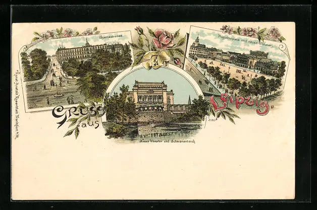 Lithographie Leipzig, Augustplatz und neues Theater, Goethestrasse, Neues Theater und Schwanenteich