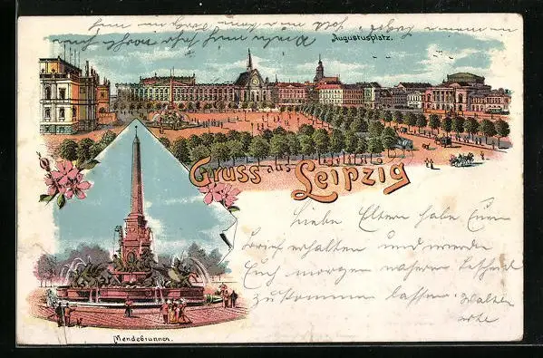 Lithographie Leipzig, Augustusplatz, Mendebrunnen