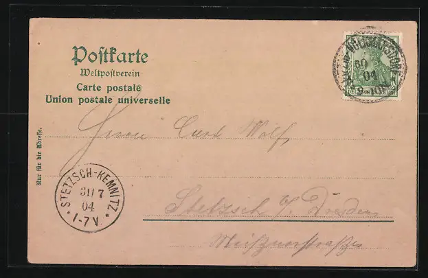 gelaufen 1904, Eckknick unten rechts, guter Zustand