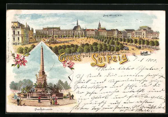 Lithographie Leipzig, Augustusplatz, Mendelbrunnen