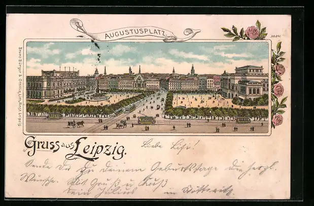 Lithographie Leipzig, Augustusplatz, Strassenbahn