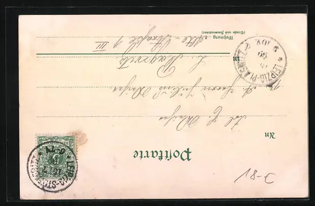 Personenbezogene Daten auf der Rückseite der Karte wurden durch blauen Textmarker unkenntlich gemacht. Die blauen Stellen sind auf die Vorderseite durchgeweicht und wirken sich negativ auf das Postkartenfoto aus