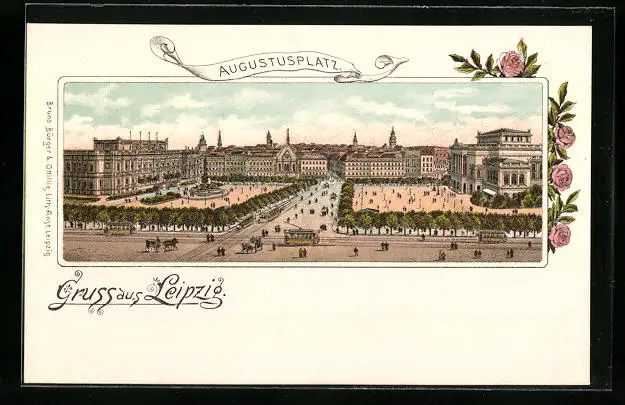 Lithographie Leipzig, Augustusplatz aus der Vogelschau