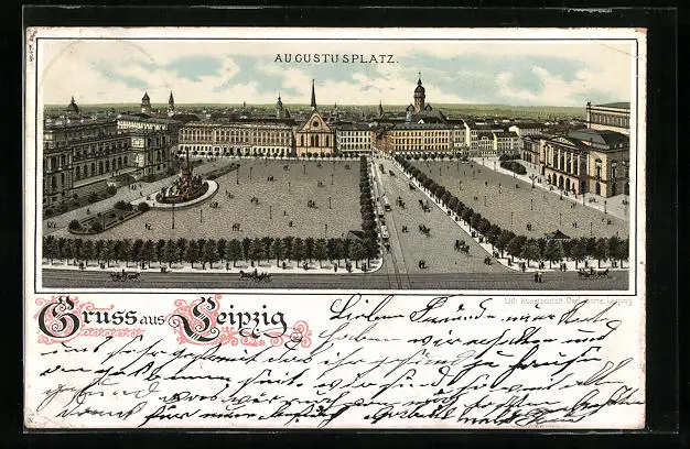 Lithographie Leipzig, Augustusplatz aus der Vogelschau