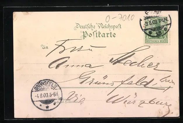 Personenbezogene Daten auf der Rückseite der Karte wurden durch blauen Textmarker unkenntlich gemacht. Die blauen Stellen sind auf die Vorderseite durchgeweicht und wirken sich negativ auf das Postkartenfoto aus