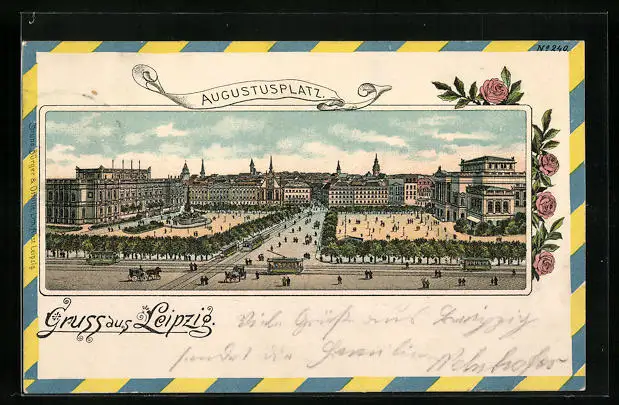 Lithographie Leipzig, Augustusplatz mit Strassenbahn aus der Vogelschau