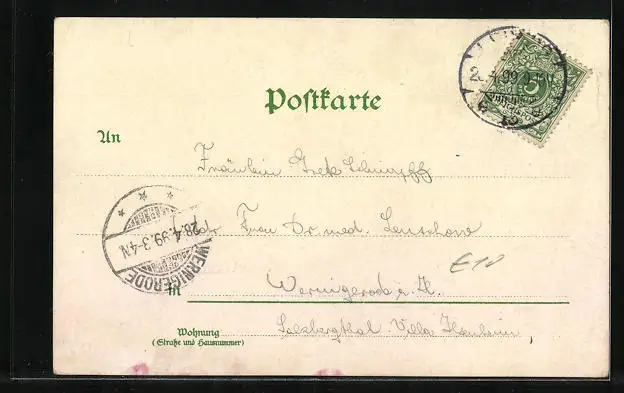 Personenbezogene Daten auf der Rückseite der Karte wurden durch blauen Textmarker unkenntlich gemacht. Die blauen Stellen sind auf die Vorderseite durchgeweicht und wirken sich negativ auf das Postkartenfoto aus