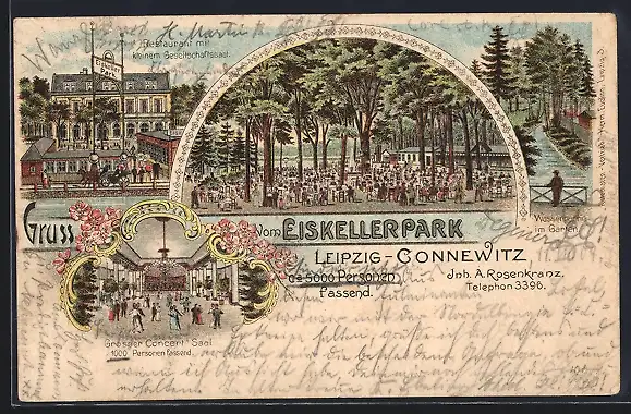 Lithographie Leipzig-Connewitz, Gasthof Eiskellerpark, Inh. A. Rosenkranz, Gartenpartie und Konzertsaal