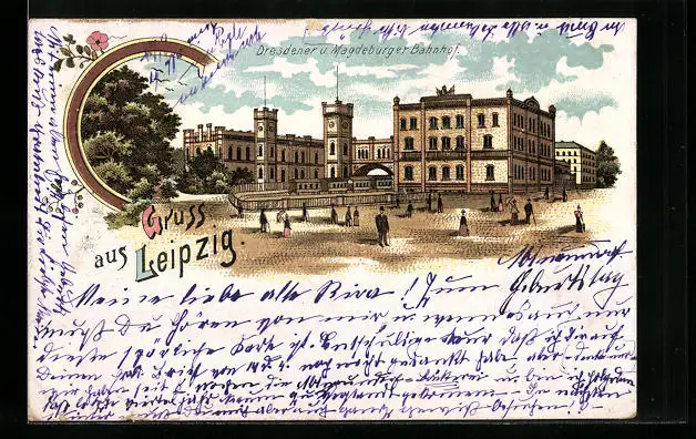 Lithographie Leipzig, Dresdener u. Magdeburger Bahnhof