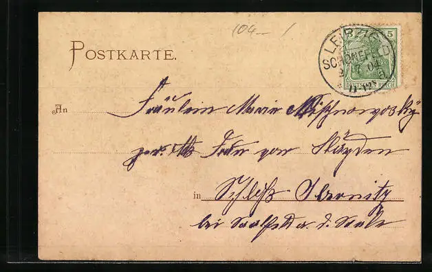 gelaufen 1904, Eckknick li. unten, Oberflächenschaden, minimaler Einriss li. unten, guter Zustand