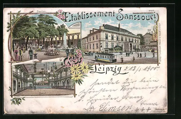 Lithographie Leipzig, Etablissement Sanssouci, Garten und Saal