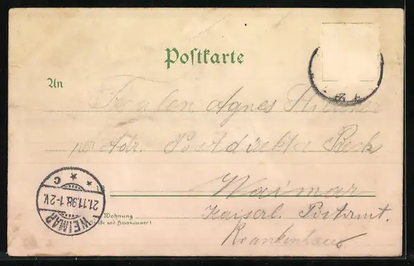 gelaufen 1898, Briefmarke entfernt, rückseitig Oberflächenschaden, Stempelspur, Eckknick oben li., guter Zustand