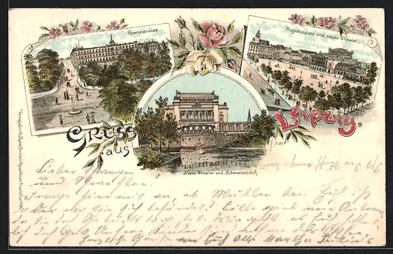 Lithographie Leipzig, Goethestrasse, Augustusplatz und Neues Theater