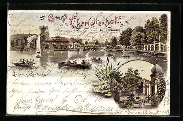 Lithographie Leipzig-Lindenau, Gasthof Charlottenhof, Ruderbootverleih