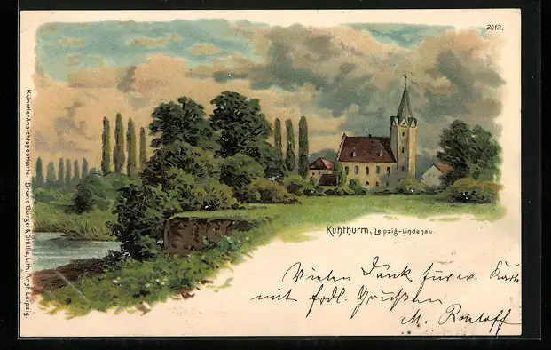 Lithographie Leipzig-Lindenau, Kuhturm mit Kirche
