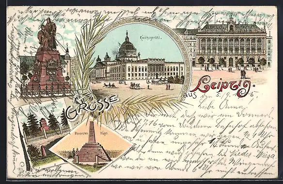 Lithographie Leipzig, Lutherdenkmal, Reichsgericht, Grassi-Museum, Napoleonstein, Monarchen Hügel