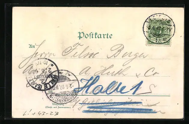 Personenbezogene Daten auf der Rückseite der Karte wurden durch blauen Textmarker unkenntlich gemacht. Die blauen Stellen sind auf die Vorderseite durchgeweicht und wirken sich negativ auf das Postkartenfoto aus