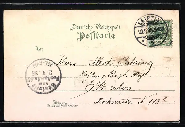 Personenbezogene Daten auf der Rückseite der Karte wurden durch blauen Textmarker unkenntlich gemacht. Die blauen Stellen sind auf die Vorderseite durchgeweicht und wirken sich negativ auf das Postkartenfoto aus