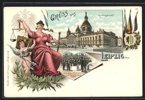 Lithographie Leipzig, Ortsansicht mit Reichsgericht und Justitia