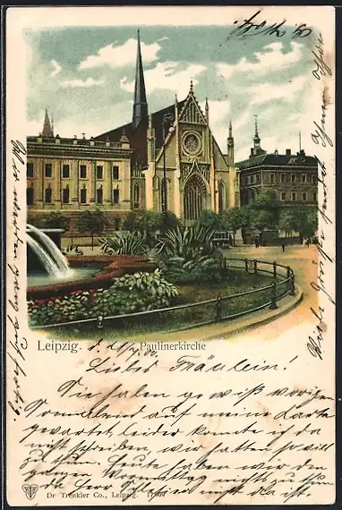 Lithographie Leipzig, Paulinerkirche mit Brunnen