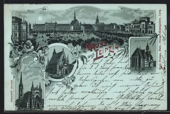 Lithographie Leipzig, Peterskirche, Thomaskirche, Nicolaikirche, Panorama