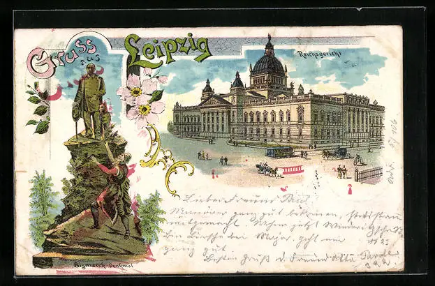 Lithographie Leipzig, Reichsgericht, Bismarckdenkmal