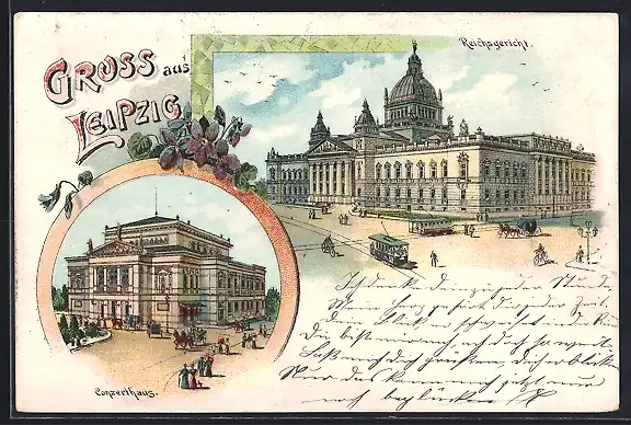 Lithographie Leipzig, Strassenbahn am Reichsgericht, Conzerthaus